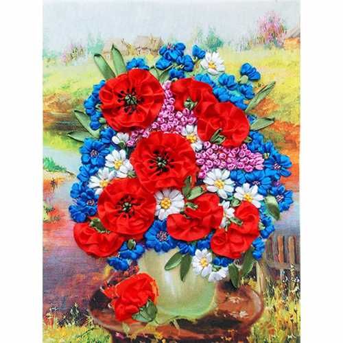 В набор для вышивания лентами Маки и васильки входят: габардин с нанесенным рисунком, атласные ленты, бисер, мулине, игла для вышивки лентами и бисером, а также подробная инструкция.