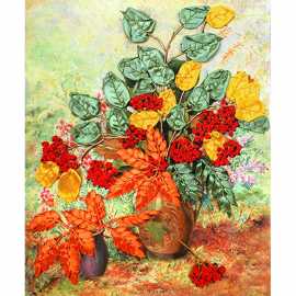 В набор для вышивания лентами Осенняя рябина входят: габардин с нанесенным рисунком, атласные ленты, бисер, мулине, игла для вышивки лентами и бисером, а также подробная инструкция.