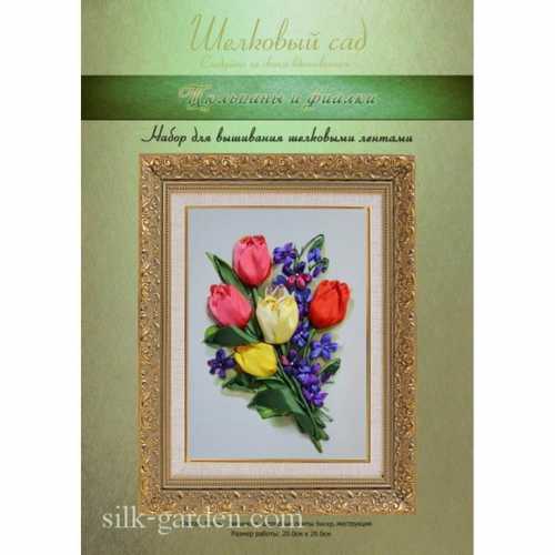 Набор для вышивки лентами из натурального шелка Тюльпаны и фиалки ТМ Шелковый сад (ВЛ-Н-1035) содержит шелковые ленты, бисер, ткань с нанесенным рисунком-схемой, подробную инструкцию и фото работы. Так как производитель не комплектует наборы иглами, мы их