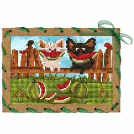 Набор для вышивки смешанной техникой Арбузное счастье компании Новая Слобода состоит из пластика Perfostitch с нанесенным рисунком и перфорацией, ниток мулине Palmira 180, бисер Slovenska Busa, ленты, рамки, иглы для вышивания, нитевдевателя, цветной схемы и подробной инструкции.