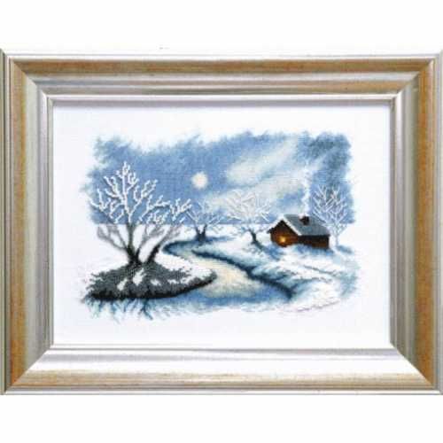 Набор для вышивания бисером и мулине Зимний вечер ТМ Чарівна мить содержит цветную схему-инструкцию, канву Zweigart Aida 14, мулине Anchor, чешский бисер Preciosa и иглы для вышивки бисером и нитками мулине.