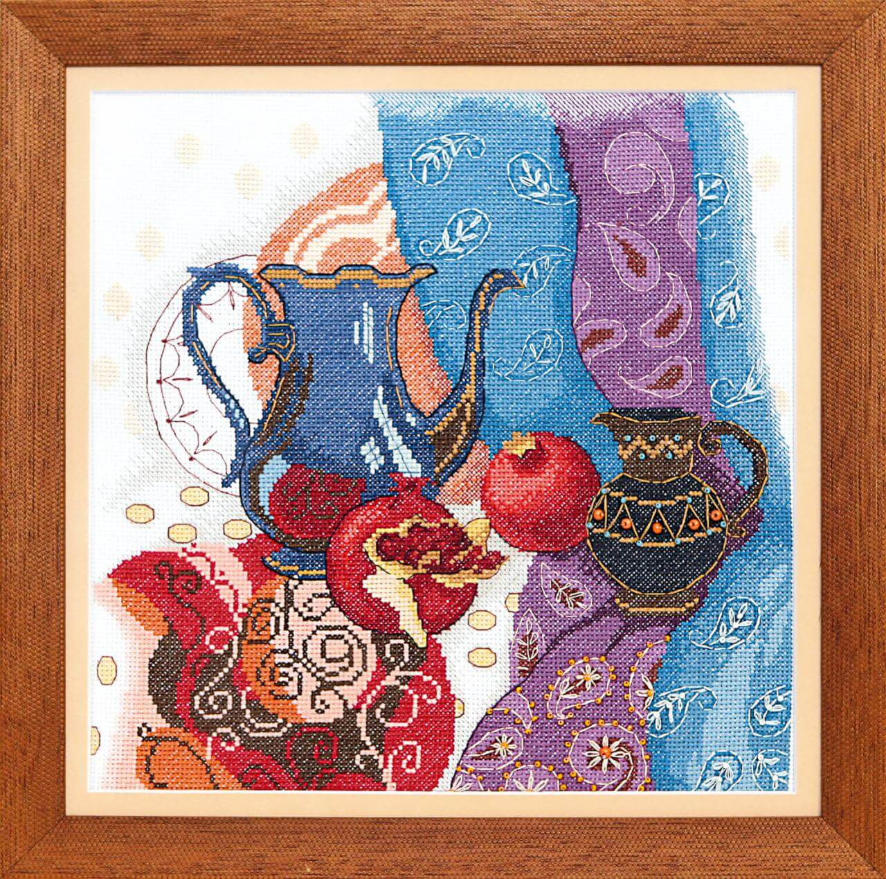Набор для вышивания крестом и бисером Восточный натюрморт содержит подробную инструкцию и цветную символьную схему, канву Aida 14, х/б мулине Bestex - 24 цвета, бисер Preciosa Ornela - 4 цвета и иглы.