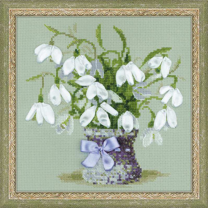 Набор для вышивания Подснежники (арт. Р-1403) ТМ Риолис содержит нитки мулине Anchor, канву (14 Aida Zweigart цветная), 2 вида игл, ленты и подробную инструкцию.