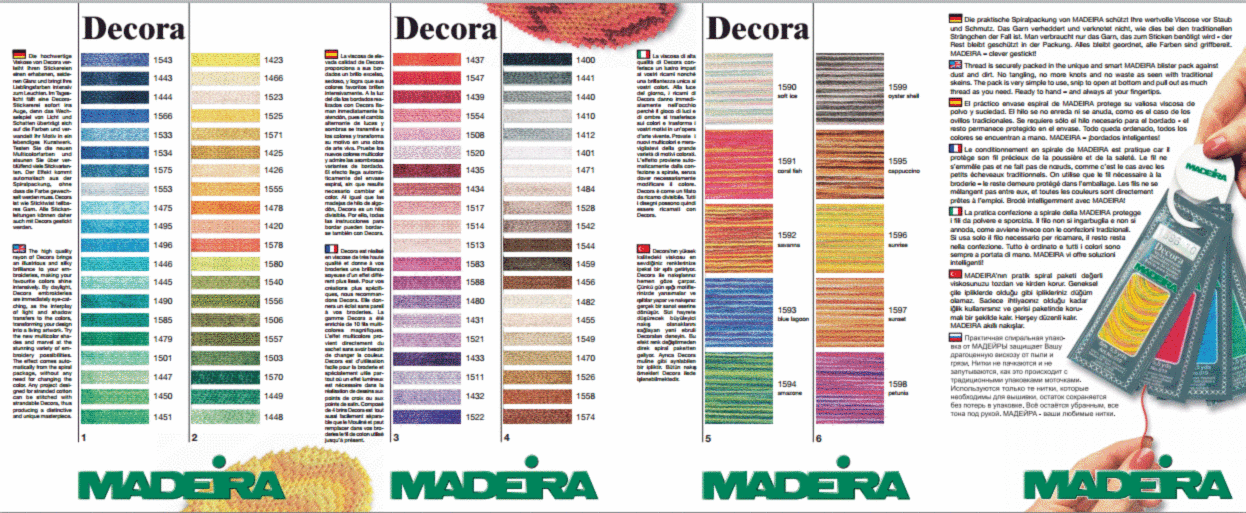 Декоративные нитки Madeira Decora (арт. 019) состоят из 100% вискозы и обладают изысканным шелковым блеском. Эти вышивальные 4-прядевые нитки длиной 5 метров упакованы в классическую для Мадейры удобную блистерную упаковку. Мулине Мадейра Декора отлично подходит как для вышивки отдельных элементов картин, вышиванок и аксессуаров в сочетании с традиционным х/б мулине, так и в качестве основных вышывальных ниток.
