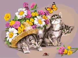 Набор для рисования Котики в шляпе, арт. BK-GX3069 (BrushMe) содержит: прогрунтованный холст на подрамнике с нанесенной номерной схемой, акриловые краски, кисти, крепеж на стену и инструкцию с фото. Без коробки. Размер 40х50см. Худ. Надежда Бусарева