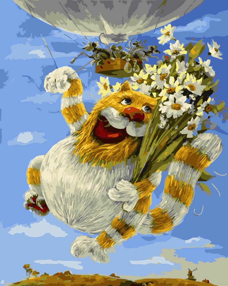 Набор для рисования Кот с ромашками, арт. BK-GX5043 (Rainbow Art) содержит: прогрунтованный холст на подрамнике с нанесенной номерной схемой, акриловые краски, кисти, крепеж на стену и инструкцию с фото. Размер 40х50см.