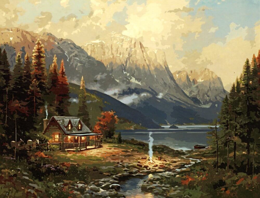 Набор для рисования Домик в горах, арт. BK-GX3409 (БК-GX) содержит: прогрунтованный холст на подрамнике с нанесенной номерной схемой, акриловые краски, кисти, крепеж на стену и инструкцию с фото. Без коробки. Размер 40х50см. Худ. Томас Кинкейд