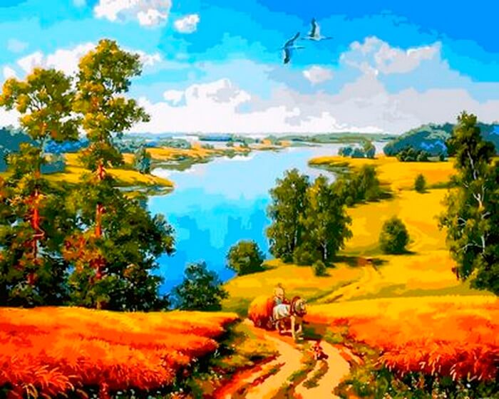 Набор для рисования Дорога среди полей, арт. MR-Q2180 (Mariposa) содержит: прогрунтованный холст на подрамнике с нанесенной номерной схемой, акриловые краски, кисти, крепеж на стену и инструкцию с фото. Размер 40х50см.
