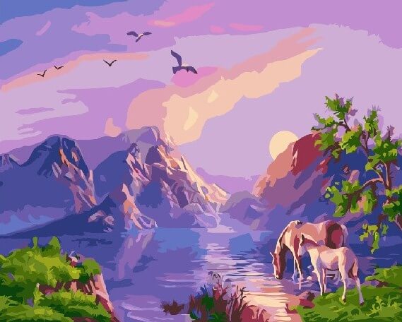 Набор для рисования Закат в горах , арт. BK-GX6645 (BrushMe) содержит: прогрунтованный холст на подрамнике с нанесенной номерной схемой, акриловые краски, кисти, крепеж на стену и инструкцию с фото. Размер 40х50см.