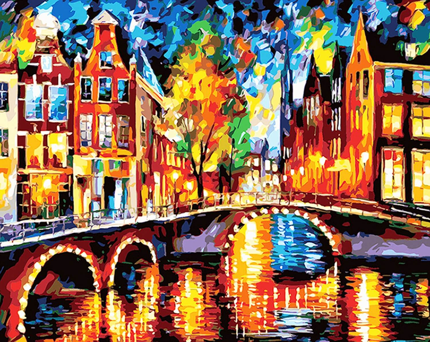 Набор для рисования Красочный Амстердам, арт. KH1013 (MENGLEI) содержит: прогрунтованный холст на подрамнике с нанесенной номерной схемой, акриловые краски, кисти, крепеж на стену и инструкцию с фото. В коробке. Размер 40х50см. Худ. Афремов, Леонид