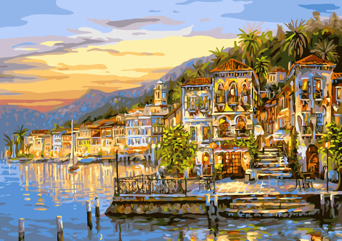 Набор для рисования Озеро Комо. Италия, арт. BK-G295 (БК-GX) содержит: прогрунтованный холст на подрамнике с нанесенной номерной схемой, акриловые краски, кисти, крепеж на стену и инструкцию с фото. Без коробки. Размер 40х50см.