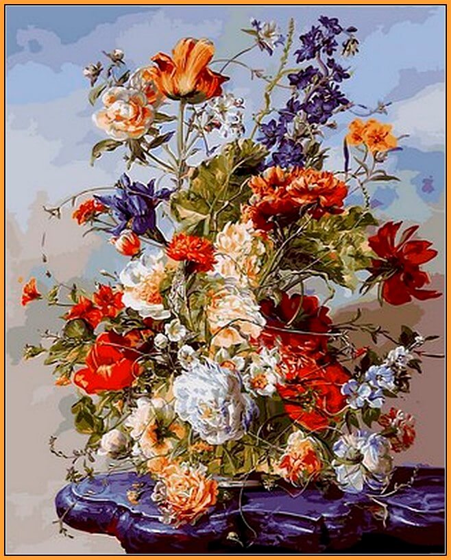 Набор для рисования Букет на пурпурном столике (в раме), арт. NB1040R (Babylon Premium) содержит: прогрунтованный холст на подрамнике с нанесенной номерной схемой, акриловые краски, кисти, крепеж на стену и инструкцию с фото. Размер 40х50см.