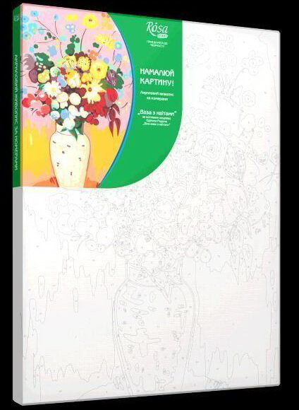 Набор для рисования Ваза с цветами (без коробки), арт. RS-N00013081 (РОСА) содержит: прогрунтованный холст на подрамнике с нанесенной номерной схемой, акриловые краски, кисти, крепеж на стену и инструкцию с фото. Размер 35х45см.