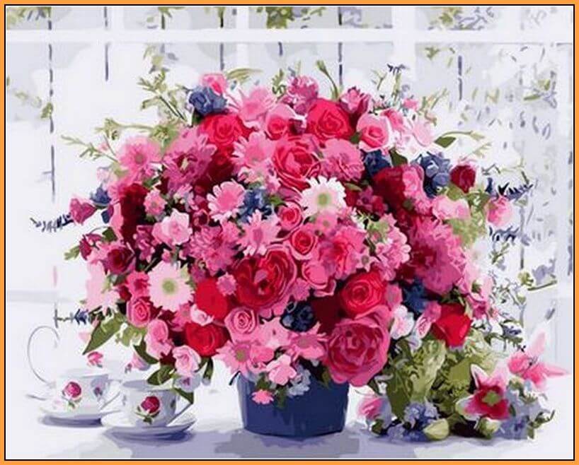 Набор для рисования Розовые хризантемы (в раме), арт. NB1233R (Babylon Premium) содержит: прогрунтованный холст на подрамнике с нанесенной номерной схемой, акриловые краски, кисти, крепеж на стену и инструкцию с фото. Размер 40х50см.