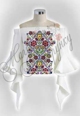 В комплект заготовки женской летней блузки входит 4 отреза габардиновой ткани с нанесенной цветной схемой-орнаментом: два рукава (75х65см), передняя часть и спинка (75х75см). Комплектуется инструкцией с указанием количества бисера и номеров мулине DMC.