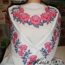 В комплект заготовки женской вышиванки входит 4 отреза габардиновой ткани с нанесенной цветной схемой-орнаментом: два рукава (75х65см), передняя часть и спинка (75х75см). Комплектуется инструкцией с указанием количества бисера и номеров мулине DMC.