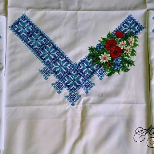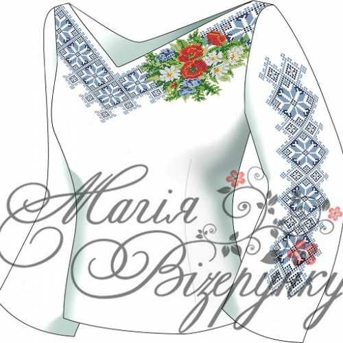 В комплект заготовки женской вышиванки входит 4 отреза габардиновой ткани с нанесенной цветной схемой-орнаментом: два рукава (75х65см), передняя часть и спинка (75х75см). Комплектуется инструкцией с указанием количества бисера и номеров мулине DMC.