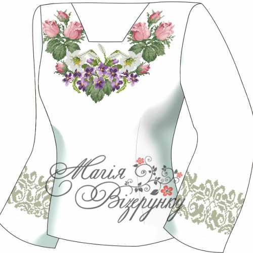 В комплект заготовки женской вышиванки входит 4 отреза габардиновой ткани с нанесенной цветной схемой-орнаментом: два рукава (75х65см), передняя часть и спинка (75х75см). Комплектуется инструкцией с указанием количества бисера и номеров мулине DMC.