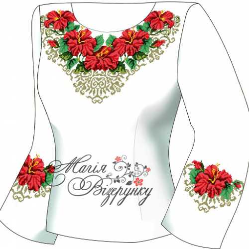 В комплект заготовки женской вышиванки входит 4 отреза габардиновой ткани с нанесенной цветной схемой-орнаментом: два рукава (75х65см), передняя часть и спинка (75х75см). Комплектуется инструкцией с указанием количества бисера и номеров мулине DMC.