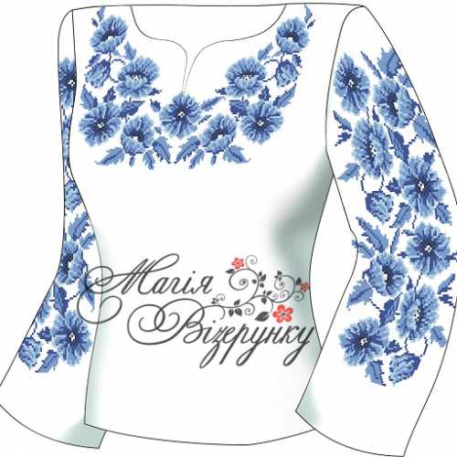 В комплект заготовки женской вышиванки входит 4 отреза габардиновой ткани с нанесенной цветной схемой-орнаментом: два рукава (75х65см), передняя часть и спинка (75х75см). Комплектуется инструкцией с указанием количества бисера и номеров мулине DMC.