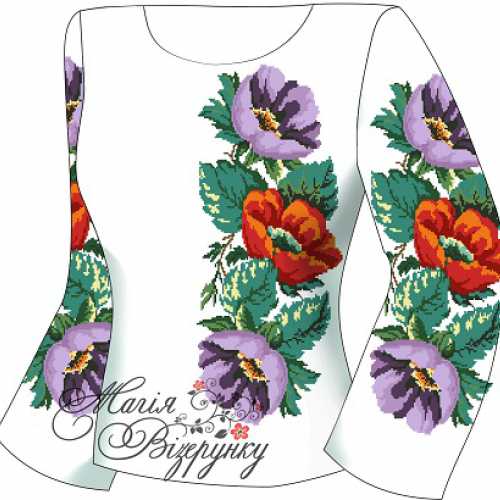 В комплект заготовки женской вышиванки входит 4 отреза габардиновой ткани с нанесенной цветной схемой-орнаментом: два рукава (75х65см), передняя часть и спинка (75х75см). Комплектуется инструкцией с указанием количества бисера и номеров мулине DMC.