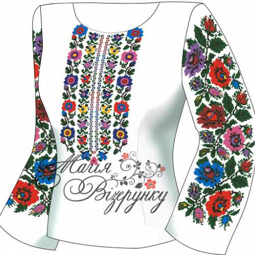 В комплект заготовки женской вышиванки входит 4 отреза габардиновой ткани с нанесенной цветной схемой-орнаментом: два рукава (75х65см), передняя часть и спинка (75х75см). Комплектуется инструкцией с указанием количества бисера и номеров мулине DMC.