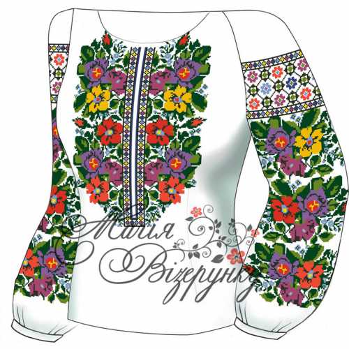 В комплект заготовки женской вышиванки входит 4 отреза габардиновой ткани с нанесенной цветной схемой-орнаментом: два рукава (75х65см), передняя часть и спинка (75х75см). Комплектуется инструкцией с указанием количества бисера и номеров мулине DMC.