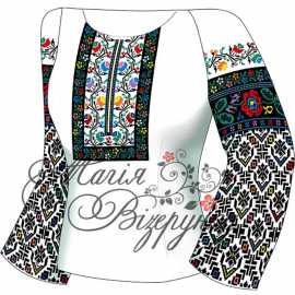 В комплект заготовки женской вышиванки входит 4 отреза габардиновой ткани с нанесенной цветной схемой-орнаментом: два рукава (75х65см), передняя часть и спинка (75х75см). Комплектуется инструкцией с указанием количества бисера и номеров мулине DMC.