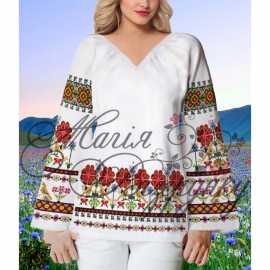 В комплект заготовки женской вышиванки входит 4 отреза габардиновой ткани с нанесенной цветной схемой-орнаментом: два рукава (75х65см), передняя часть и спинка (75х75см). Комплектуется инструкцией с указанием количества бисера и номеров мулине DMC.