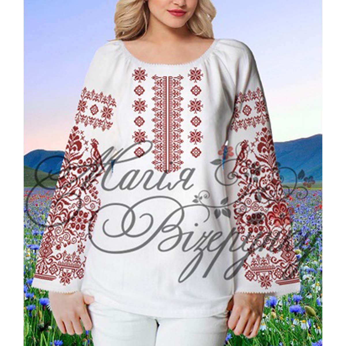 В комплект заготовки женской вышиванки входит 4 отреза габардиновой ткани с нанесенной цветной схемой-орнаментом: два рукава (75х65см), передняя часть и спинка (75х75см). Комплектуется инструкцией с указанием количества бисера и номеров мулине DMC.