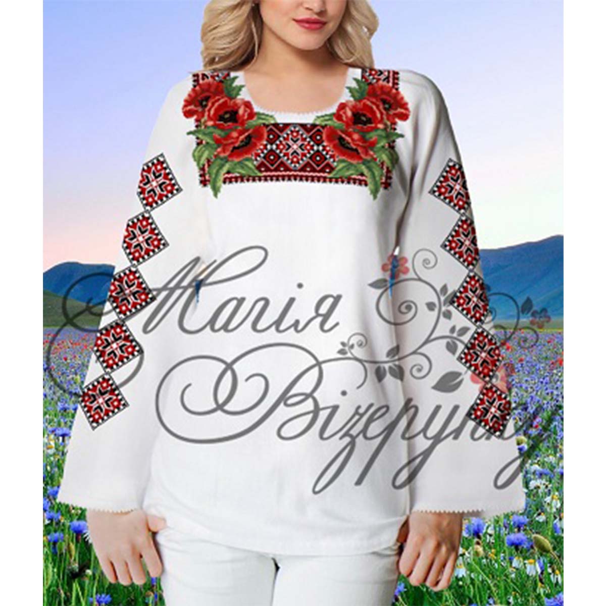 В комплект заготовки женской вышиванки входит 4 отреза габардиновой ткани с нанесенной цветной схемой-орнаментом: два рукава (75х65см), передняя часть и спинка (75х75см). Комплектуется инструкцией с указанием количества бисера и номеров мулине DMC.