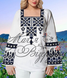 В комплект заготовки женской вышиванки входит 4 отреза габардиновой ткани с нанесенной цветной схемой-орнаментом: два рукава (75х65см), передняя часть и спинка (75х75см). Комплектуется инструкцией с указанием количества бисера и номеров мулине DMC.
