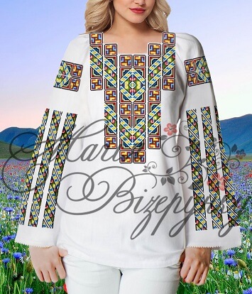 В комплект заготовки женской вышиванки входит 4 отреза габардиновой ткани с нанесенной цветной схемой-орнаментом: два рукава (75х65см), передняя часть и спинка (75х75см). Комплектуется инструкцией с указанием количества бисера и номеров мулине DMC.