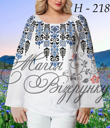 В комплект заготовки женской вышиванки входит 4 отреза габардиновой ткани с нанесенной цветной схемой-орнаментом: два рукава (75х65см), передняя часть и спинка (75х75см). Комплектуется инструкцией с указанием количества бисера и номеров мулине DMC.