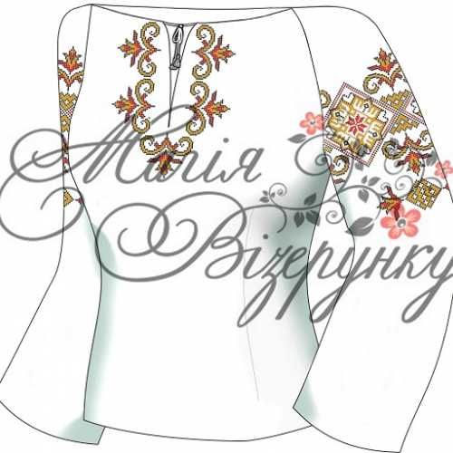 В комплект заготовки женской вышиванки входит 4 отреза габардиновой ткани с нанесенной цветной схемой-орнаментом: два рукава (75х65см), передняя часть и спинка (75х75см). Комплектуется инструкцией с указанием количества бисера и номеров мулине DMC.