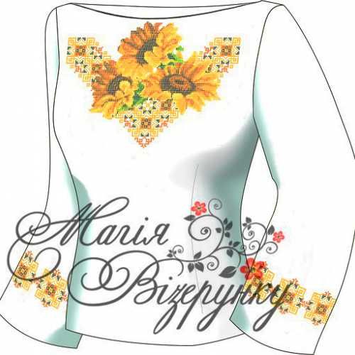 В комплект заготовки женской вышиванки входит 4 отреза габардиновой ткани с нанесенной цветной схемой-орнаментом: два рукава (75х65см), передняя часть и спинка (75х75см). Комплектуется инструкцией с указанием количества бисера и номеров мулине DMC.