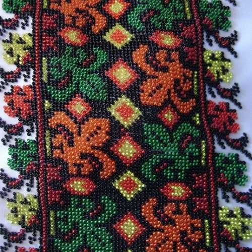 В комплект заготовки женской вышиванки входит 4 отреза габардиновой ткани с нанесенной цветной схемой-орнаментом: два рукава (75х65см), передняя часть и спинка (75х75см). Комплектуется инструкцией с указанием количества бисера и номеров мулине DMC.