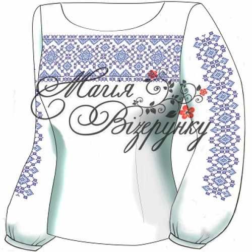 В комплект заготовки женской вышиванки входит 4 отреза габардиновой ткани с нанесенной цветной схемой-орнаментом: два рукава (75х65см), передняя часть и спинка (75х75см). Комплектуется инструкцией с указанием количества бисера и номеров мулине DMC.