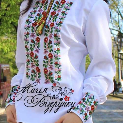 В комплект заготовки женской вышиванки входит 4 отреза габардиновой ткани с нанесенной цветной схемой-орнаментом: два рукава (75х65см), передняя часть и спинка (75х75см). Комплектуется инструкцией с указанием количества бисера и номеров мулине DMC.