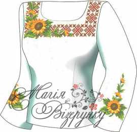 В комплект заготовки женской вышиванки входит 4 отреза габардиновой ткани с нанесенной цветной схемой-орнаментом: два рукава (75х65см), передняя часть и спинка (75х75см). Комплектуется инструкцией с указанием количества бисера и номеров мулине DMC.