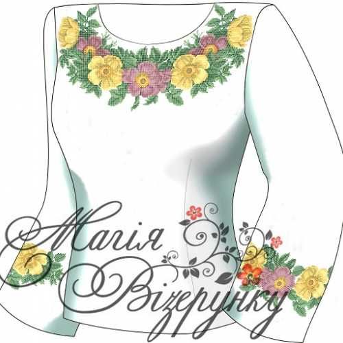 В комплект заготовки женской вышиванки входит 4 отреза габардиновой ткани с нанесенной цветной схемой-орнаментом: два рукава (75х65см), передняя часть и спинка (75х75см). Комплектуется инструкцией с указанием количества бисера и номеров мулине DMC.