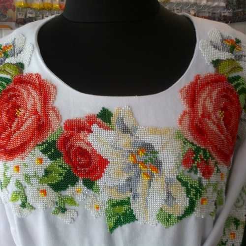 В комплект заготовки женской вышиванки входит 4 отреза габардиновой ткани с нанесенной цветной схемой-орнаментом: два рукава (75х65см), передняя часть и спинка (75х75см). Комплектуется инструкцией с указанием количества бисера и номеров мулине DMC.