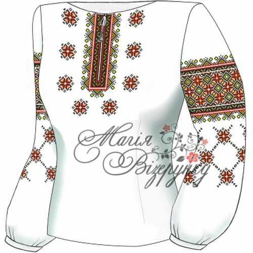 В комплект заготовки женской вышиванки входит 4 отреза габардиновой ткани с нанесенной цветной схемой-орнаментом: два рукава (75х65см), передняя часть и спинка (75х75см). Комплектуется инструкцией с указанием количества бисера и номеров мулине DMC.