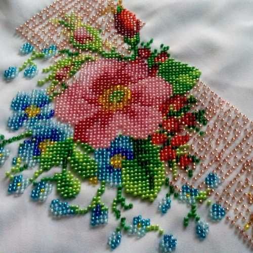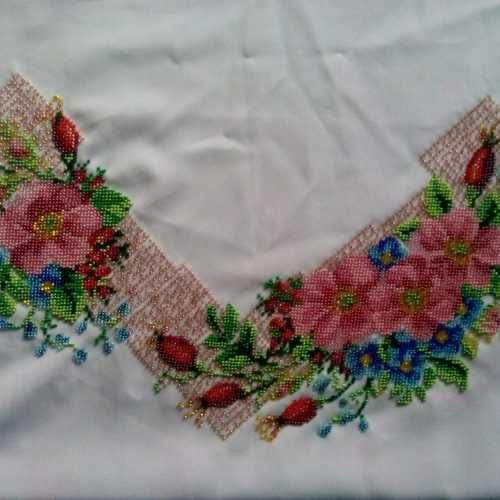 В комплект заготовки женской вышиванки входит 4 отреза габардиновой ткани с нанесенной цветной схемой-орнаментом: два рукава (75х65см), передняя часть и спинка (75х75см). Комплектуется инструкцией с указанием количества бисера и номеров мулине DMC.