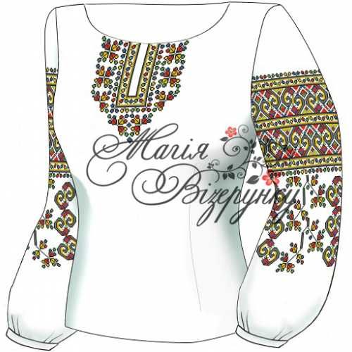 В комплект заготовки женской вышиванки входит 4 отреза габардиновой ткани с нанесенной цветной схемой-орнаментом: два рукава (75х65см), передняя часть и спинка (75х75см). Комплектуется инструкцией с указанием количества бисера и номеров мулине DMC.