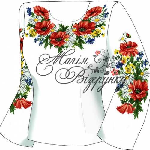 В комплект заготовки женской вышиванки входит 4 отреза габардиновой ткани с нанесенной цветной схемой-орнаментом: два рукава (75х65см), передняя часть и спинка (75х75см). Комплектуется инструкцией с указанием количества бисера и номеров мулине DMC.
