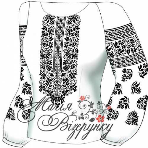 В комплект заготовки женской вышиванки входит 4 отреза габардиновой ткани с нанесенной цветной схемой-орнаментом: два рукава (75х65см), передняя часть и спинка (75х75см). Комплектуется инструкцией с указанием количества бисера и номеров мулине DMC.