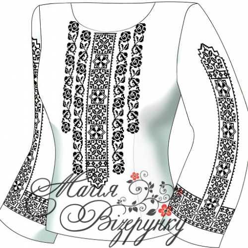 В комплект заготовки женской вышиванки входит 4 отреза габардиновой ткани с нанесенной цветной схемой-орнаментом: два рукава (75х65см), передняя часть и спинка (75х75см). Комплектуется инструкцией с указанием количества бисера и номеров мулине DMC.