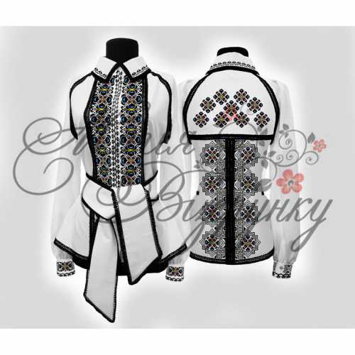 В комплект заготовки модельной женской сорочки под вышивку входит габардиновая ткань с нанесенным цветным рисунком-схемой, состоящее из отрезов: два рукава (75х65см), передняя часть (75х75см), спинка (75х65см), кокетка, манжеты, воротничок и инструкция.