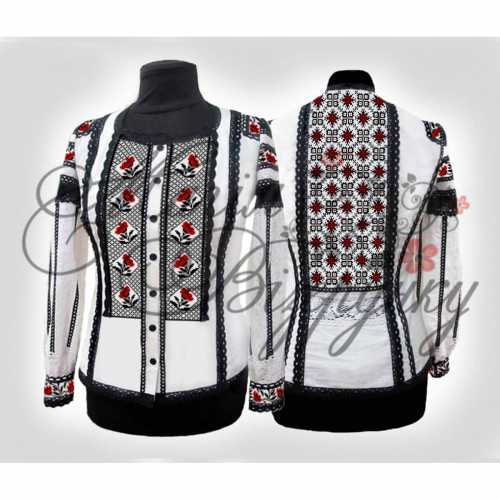 В комплект заготовки модельной женской сорочки под вышивку входит домотканное полотно с нанесенным цветным рисунком-схемой, состоящее из отрезов: два рукава (75х65см), передняя часть (75х75см), спинка (75х65см), кокетка, манжеты, воротничок и инструкция.